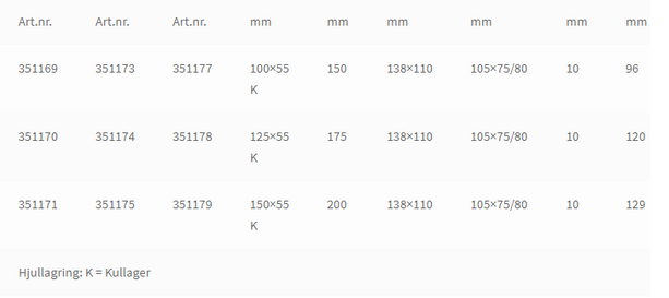 Ytbehandling: Förzinkad. Länkhjul kan förses med separat 4-vägs riktningsspärr: se tabell