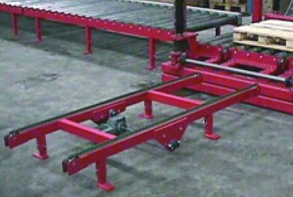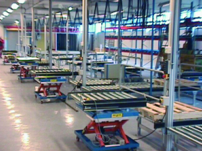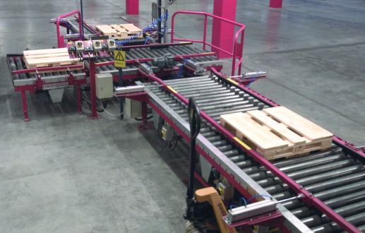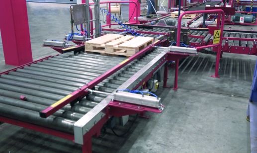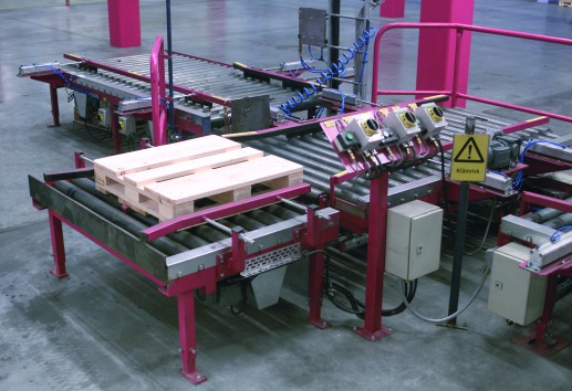 Automatiskt rullbanesystem för små och stora pallar, omställning sker med justerbara sidokanter. Rullbanor, pushrar, vridbord och växlar är delar i hanteringssystemet. Skyddsräcken och manöverpulpet är utarbetade i samråd med operatören.