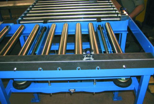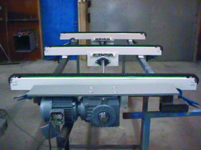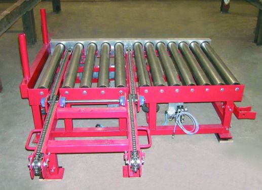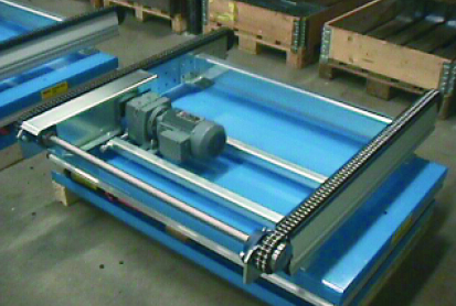 12-strängad kedjetransportör som är höj- och sänkbar för överväxling av långgods på drivna rullbanor. Rullbanorna är försedda med pneumatiskt styrda guidehjul. Anläggningen har hög precision i transport, sidostyrning, höj- och sänkrörelser och fixering av gods.