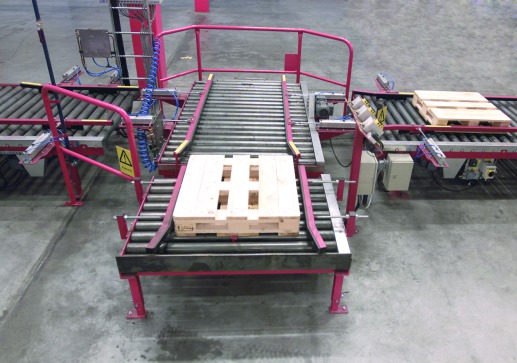 Systemet innehåller trevägskorsning med ett vridbord som växlar pallen åt rätt håll. Det finns också pneumatiskt inställbara styrkanter.